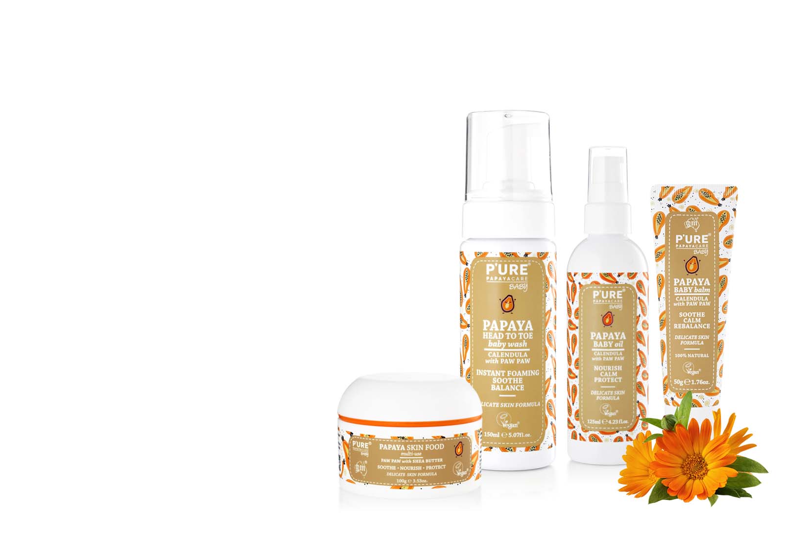 Dòng sản phẩm PURE Papaya Baby mang đến một quy trình chăm sóc da hoàn chỉnh, bao gồm Sữa tắm gội Papaya Head to Toe Baby Wash, Kem dưỡng Papaya Baby Moisturising Lotion, Sáp dưỡng Papaya Baby Balm và Dầu dưỡng Papaya Baby Oil.