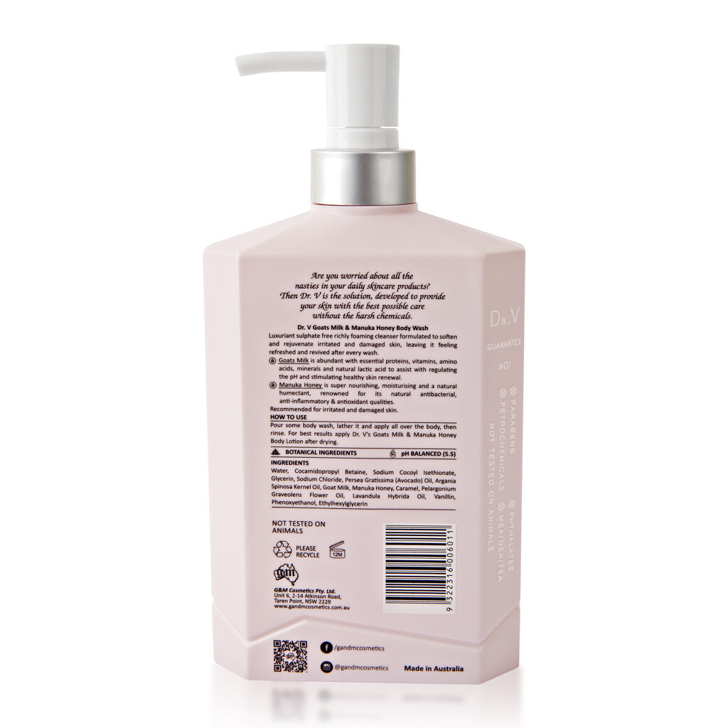 Sữa tắm Chủ động Sữa Dê & Mật Ong Manuka của Dr. V là sản phẩm tạo bọt phong phú, không chứa sulfate, được thiết kế để làm mềm và phục hồi làn da bị kích ứng, giúp da cảm thấy tươi mới và tràn đầy sức sống sau mỗi lần tắm.