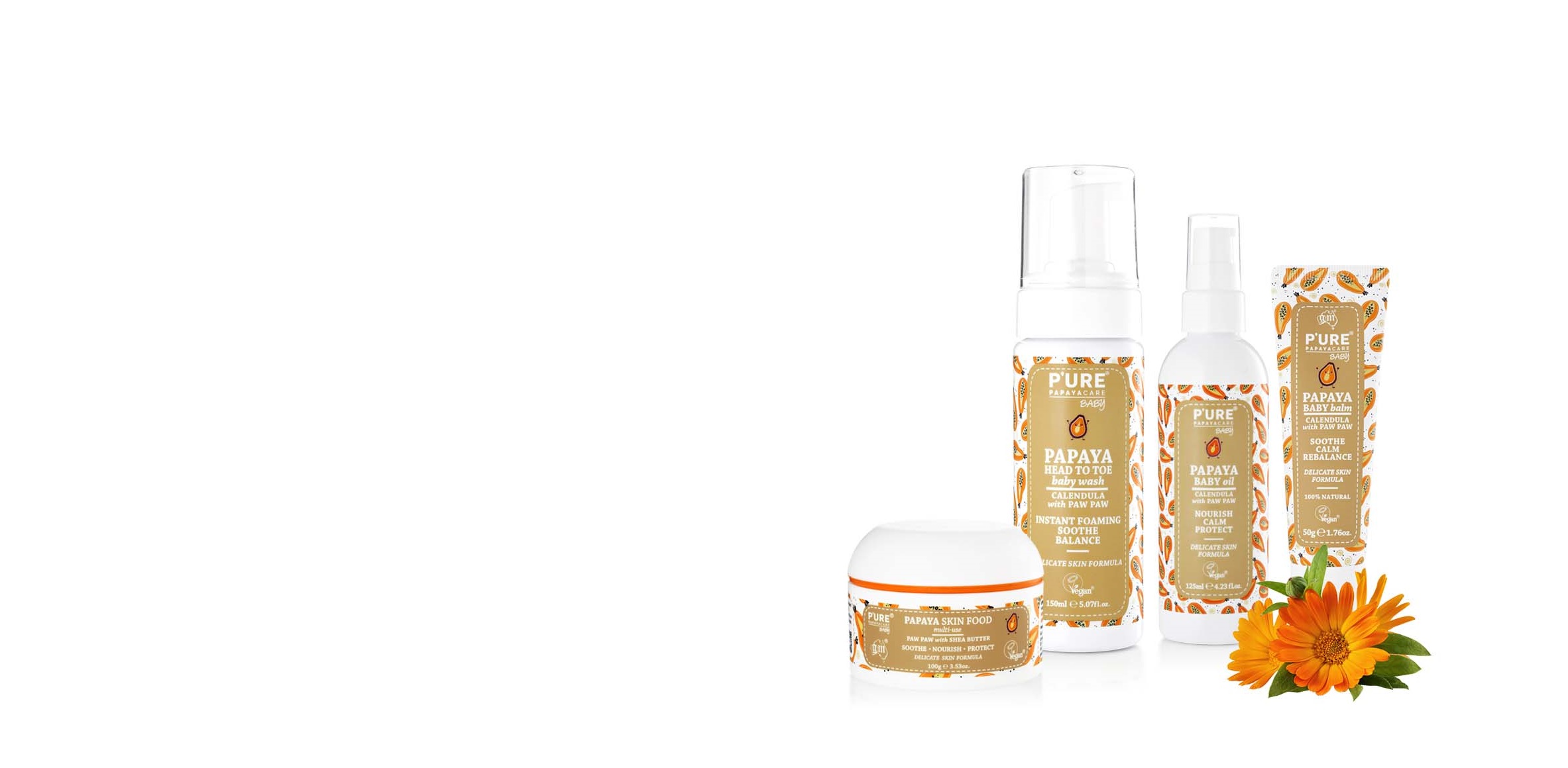 Dòng sản phẩm PURE Papaya Baby cung cấp một quy trình chăm sóc da hoàn chỉnh từ sữa tắm Papaya Head to Toe Baby Wash đến kem dưỡng ẩm Papaya Baby Moisturising Lotion, kem dưỡng thể Baby Balm & dầu dưỡng da Baby Oil.